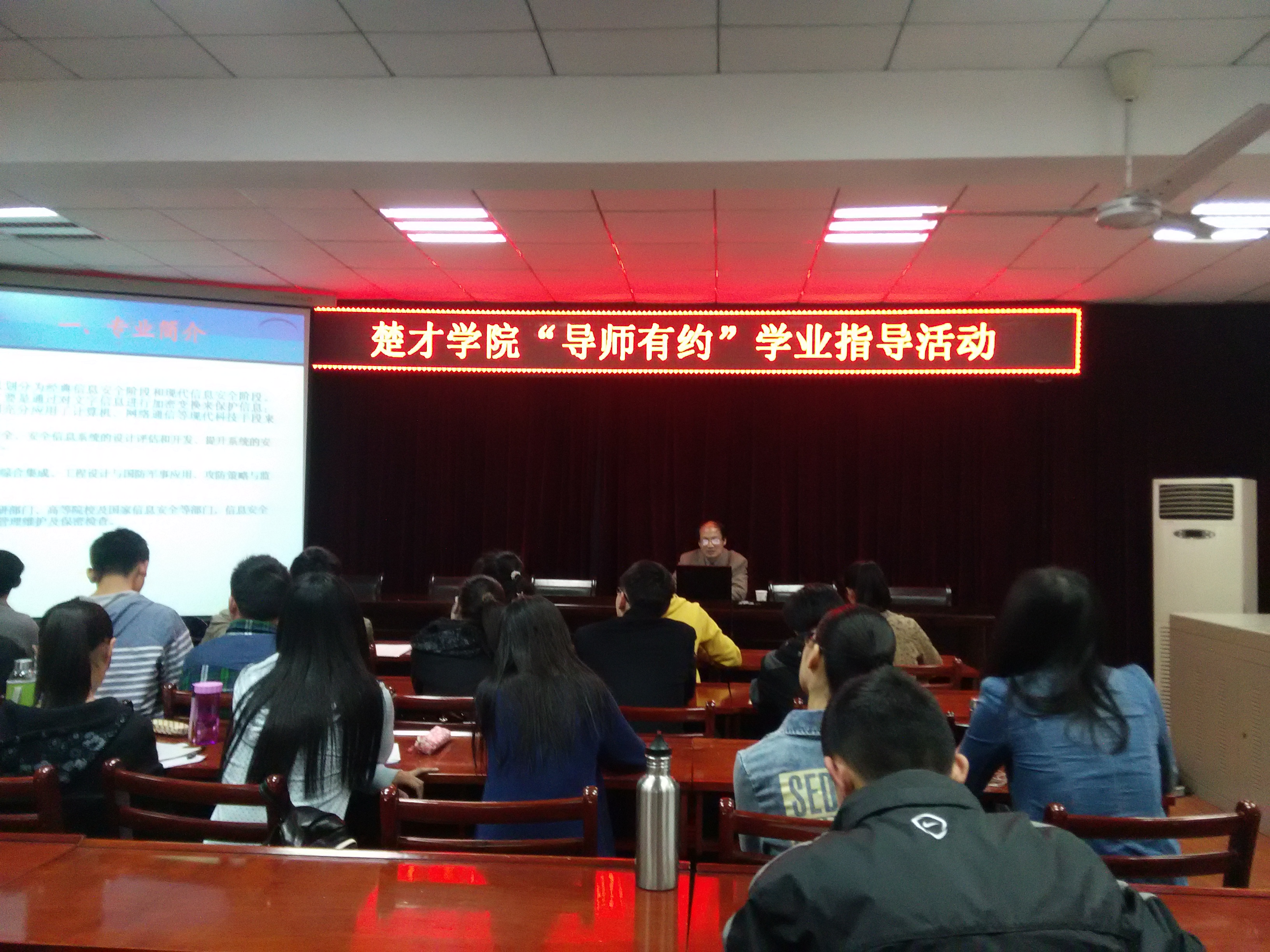 4月15日下午,计算机与信息工程公司杨维明教授在田家炳楼223报告厅为2014级楚才计划理科班作专业宣讲。