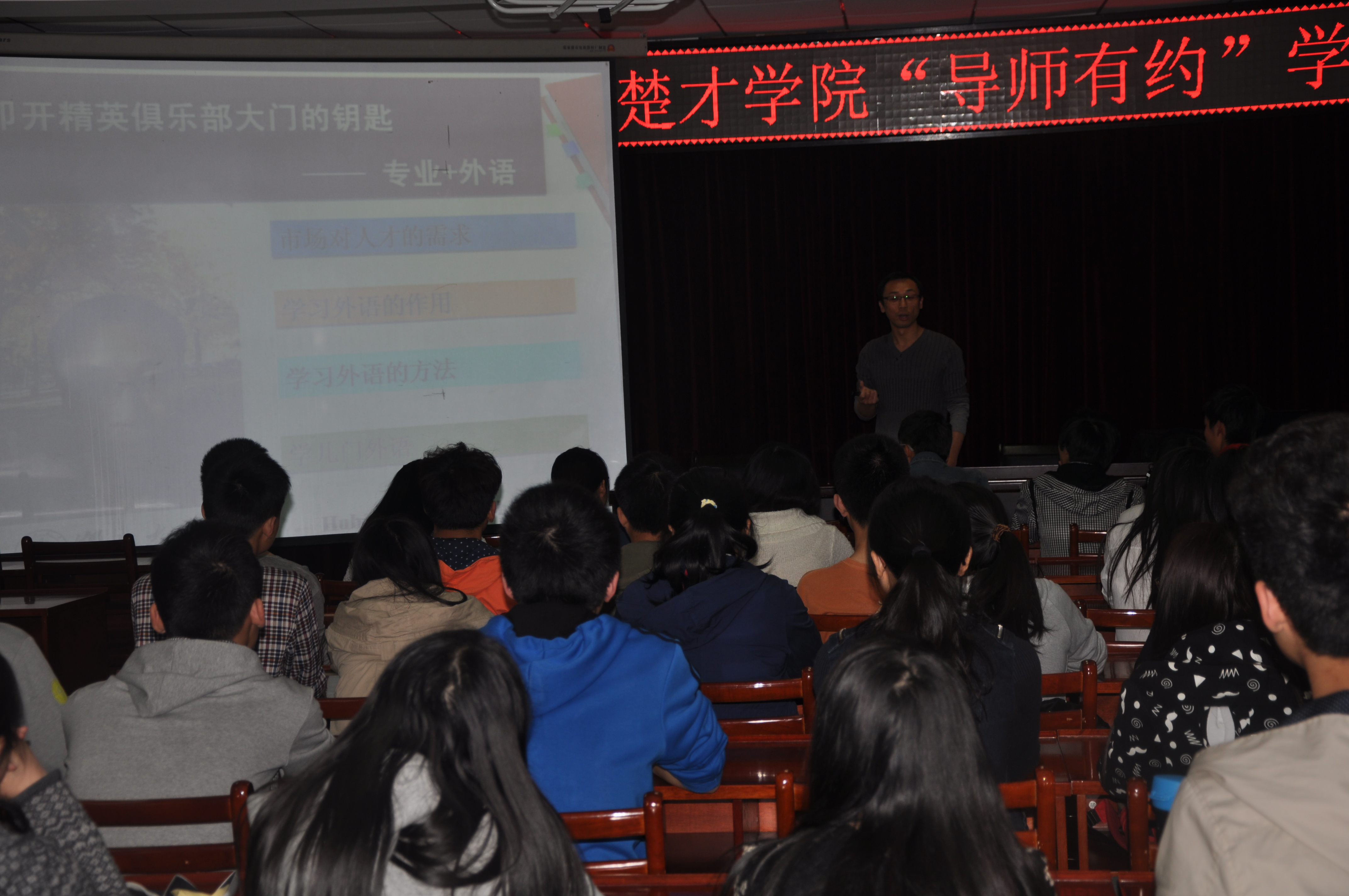 4月22日下午,外国语公司周红兵老师在田家炳楼223报告厅作“叩开精英俱乐部大门的钥匙——专业+英语”为主题的讲座,2014级全体员工参加。